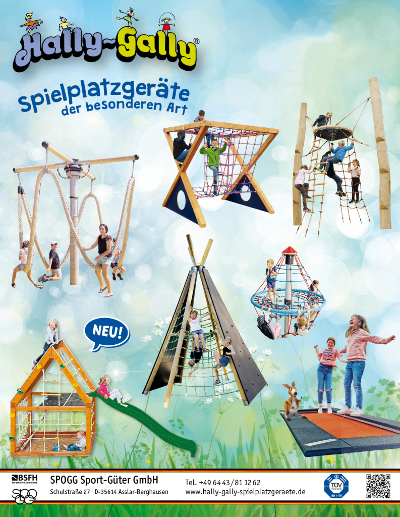Hally-Gally Spielplatzgeräte sind Geräte der besonderen Art, als Blickfang oder auch als Nischengerät geeignet. Trampoline, Geräte mit Dreh-Wipp-Mechanik, Karussells, Schaukeln, Klettergeräte und solche Geräte mit speziellem Design wie zum Beispiel das Domizil, Quatrix, Tipi, Traumfänger, Hamsterrad, Kometenschweif, Achterbahn & Co. sind Bestandteil des Angebots. Für alle Altersgruppen ist etwas dabei. Die Geräte eignen sich sowohl zum Chatten und Chillen als auch zum grenzenlosen Austoben in Form von Springen auf einem den zahlreichen Trampolinen oder in Gang setzen von Dreh-Wipp-Mich-Geräten. Lange getestet halten sie jeder Belastung stand. Hally-Gally Trampoline, die sich seit Jahren als Spielplatzgeräte bewährt haben, gibt es in allen möglichen Formen und Größen. Sie sind mit Kunststoff-, oder geschlossener Sprungmatte erhältlich und fördern auf spielerische Art die Motorik, den Gleichgewichtssinn und ein kommunikatives Miteinander. Viele davon sind behindertengerecht und werden auch in therapeutischen Einrichtungen eingesetzt.